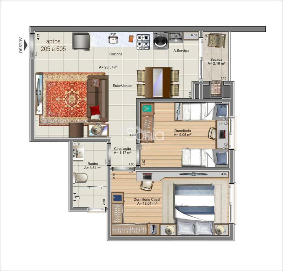 2 Dormitórios, Sala, Cozinha e Lavanderia Integrados
