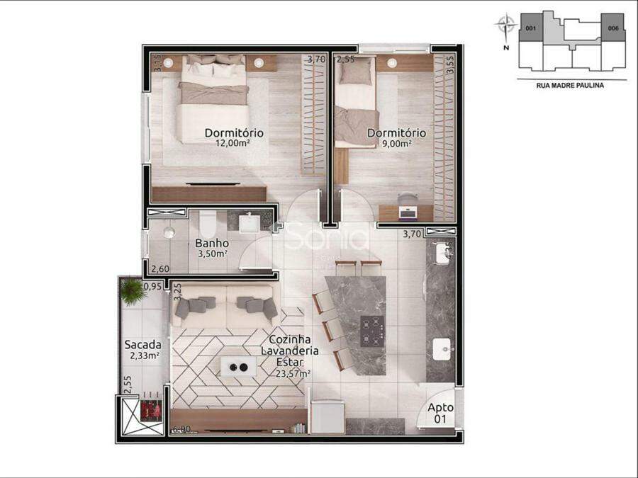 Sonia imóveis vende apartamento em fase de construção, localizado no bairro Triangulo. Composto por dois dormitórios, sala, cozinha e lavanderia integrados, banheiro.Sacada com churrasqueira.Posição solar leste/sul.