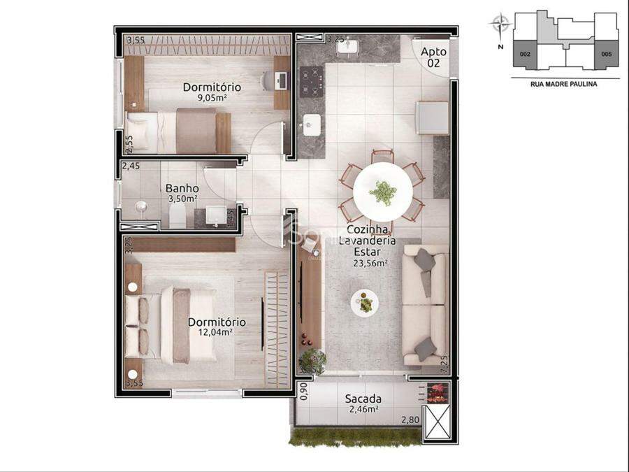 Sonia imóveis vende apartamento em fase de construção, localizado no bairro Triangulo. Composto por dois dormitórios, sala, cozinha e lavanderia integrados, banheiro.Sacada com churrasqueira.Posição solar norte/oeste.