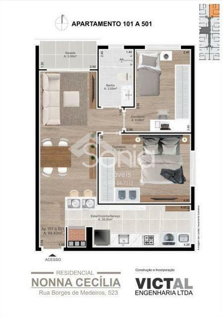 Composto por dois dormitórios, cozinha, lavanderia e sala de estar integrados, sacada, banheiro.