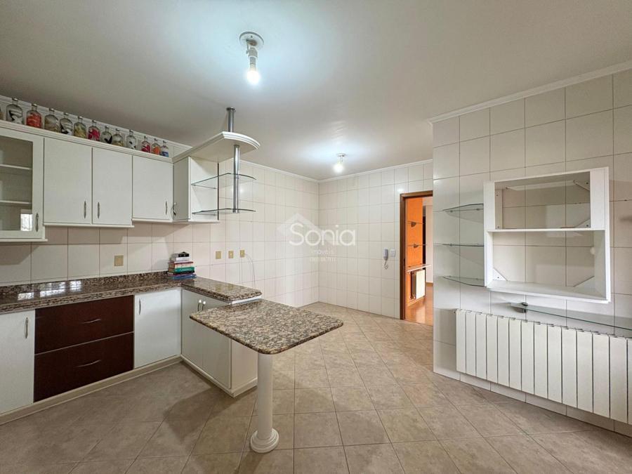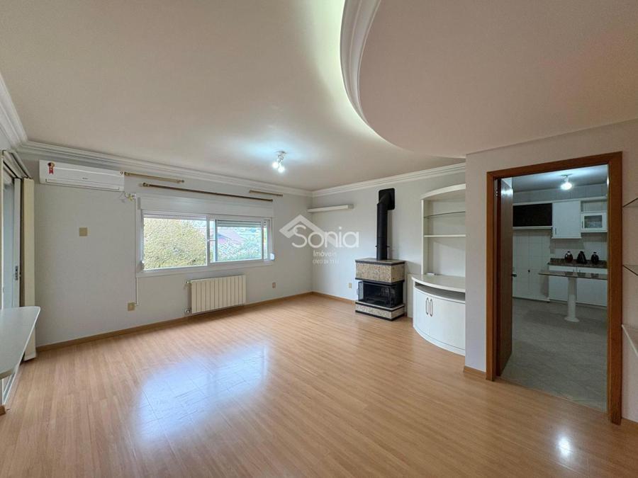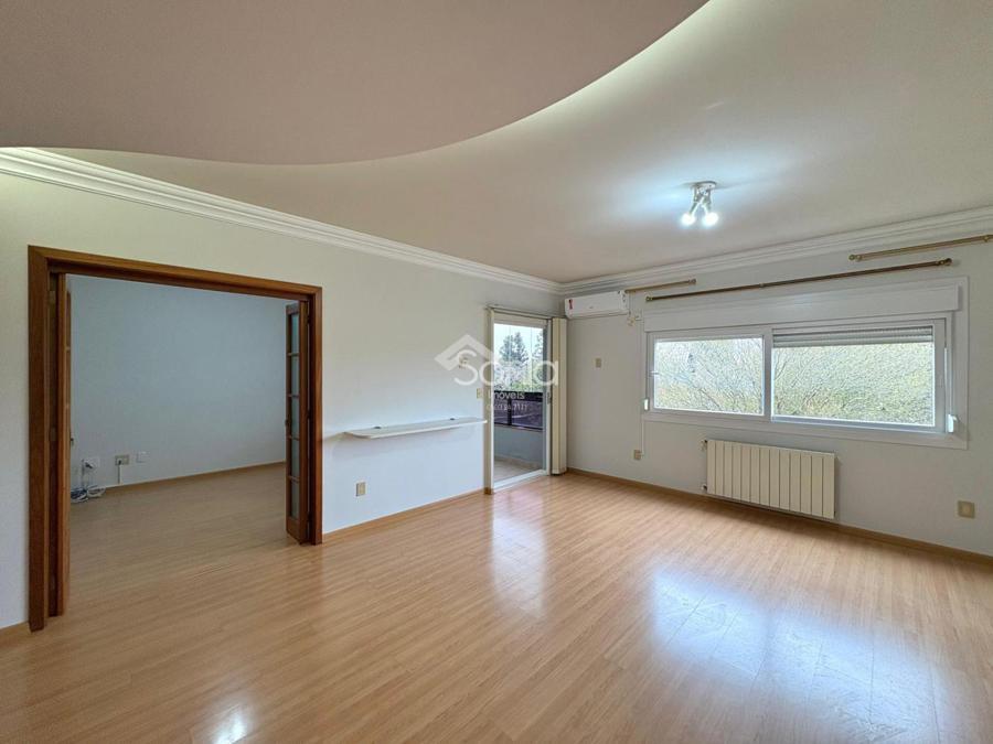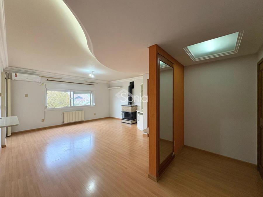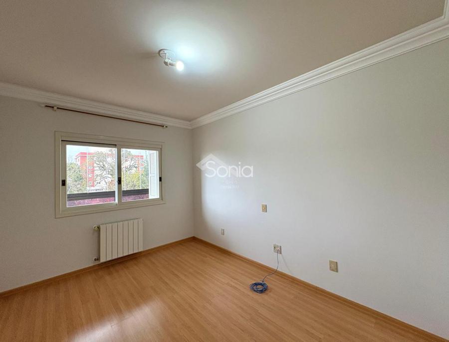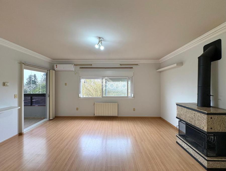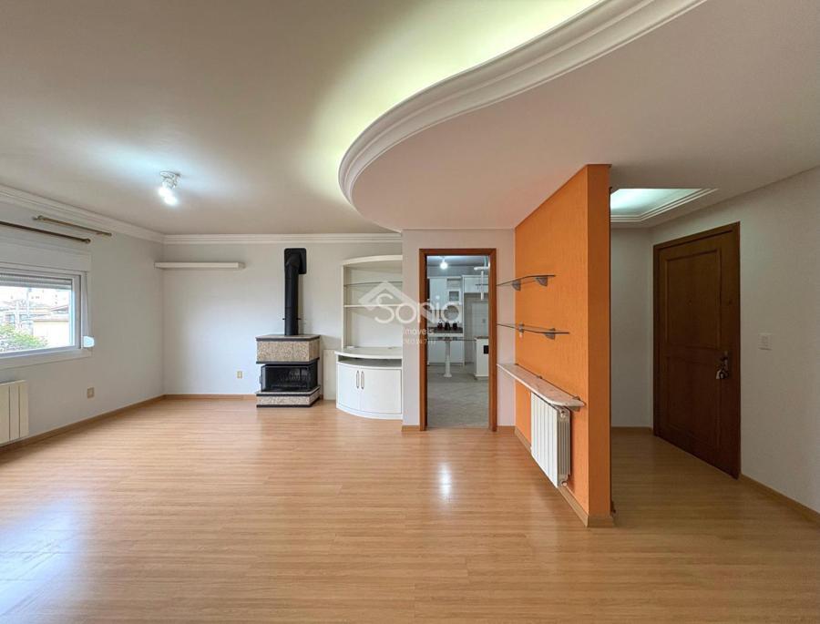 São três dormitórios, incluindo uma suíte com sacada, banheiro social, calefação e duas vagas de garagem.