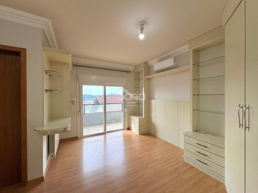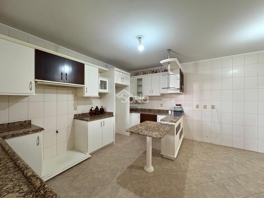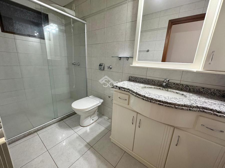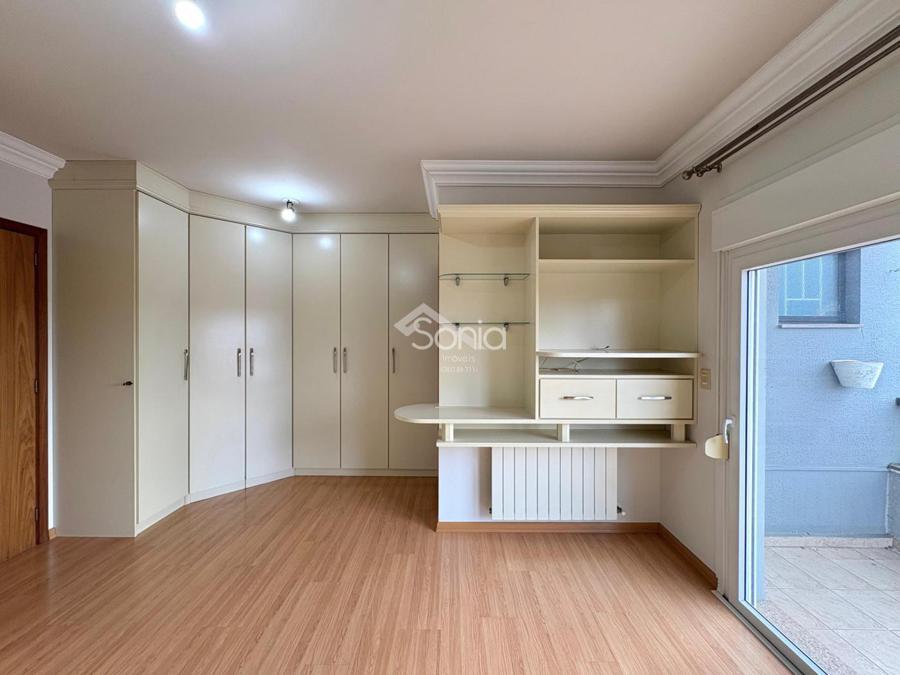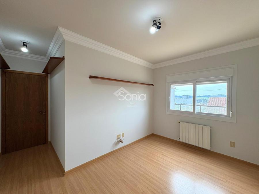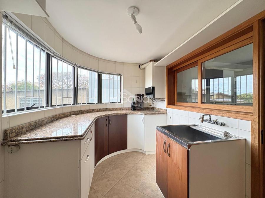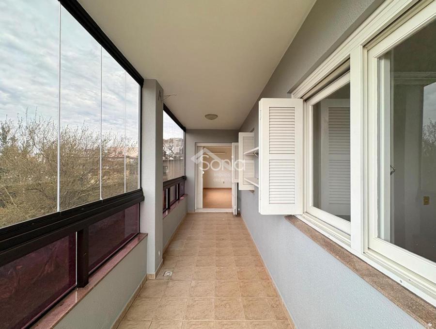 São três dormitórios, incluindo uma suíte com sacada, banheiro social, calefação e duas vagas de garagem.