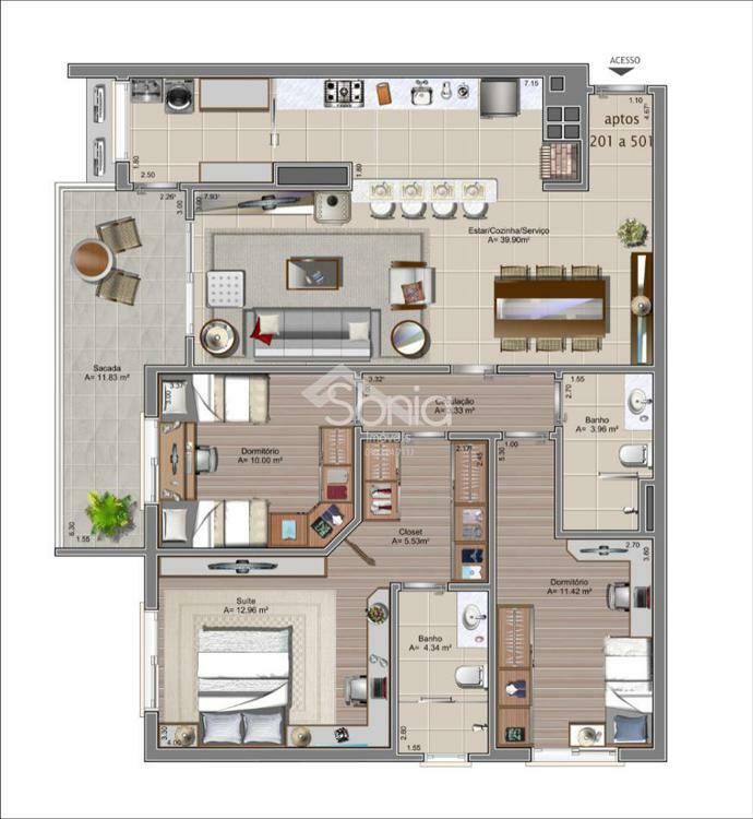 Sonia imóveis vende apartamento composto de três dormitórios sendo uma suíte, banheiro social, sala de estar e jantar integradas com espera para lareira, cozinha e lavanderia;