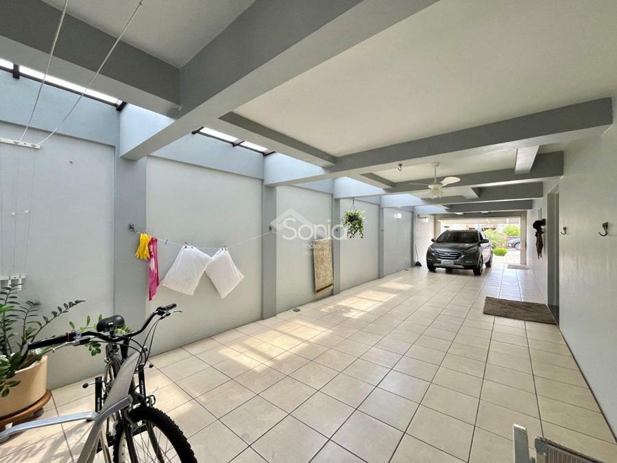 Andar inferior: garagem espaçosa, sala de estar integrada à uma cozinha, depósito e área de serviço.