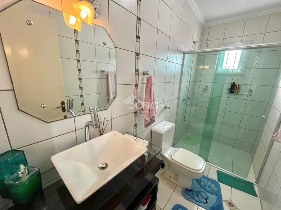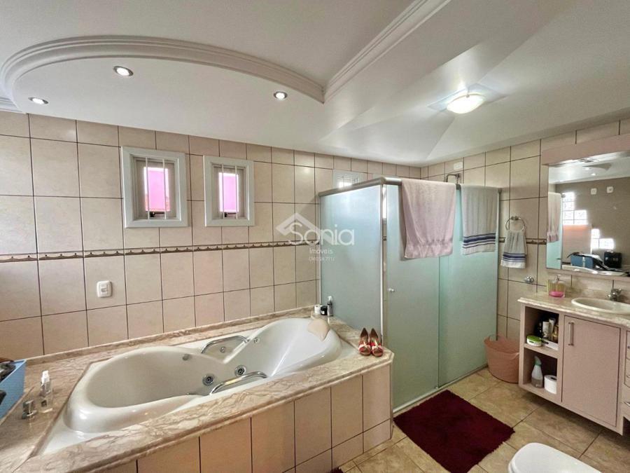 Andar superior: sala de estar, sala de jantar, cozinha, quatro dormitórios, sendo duas suítes (uma delas com banheira) e banheiro social.